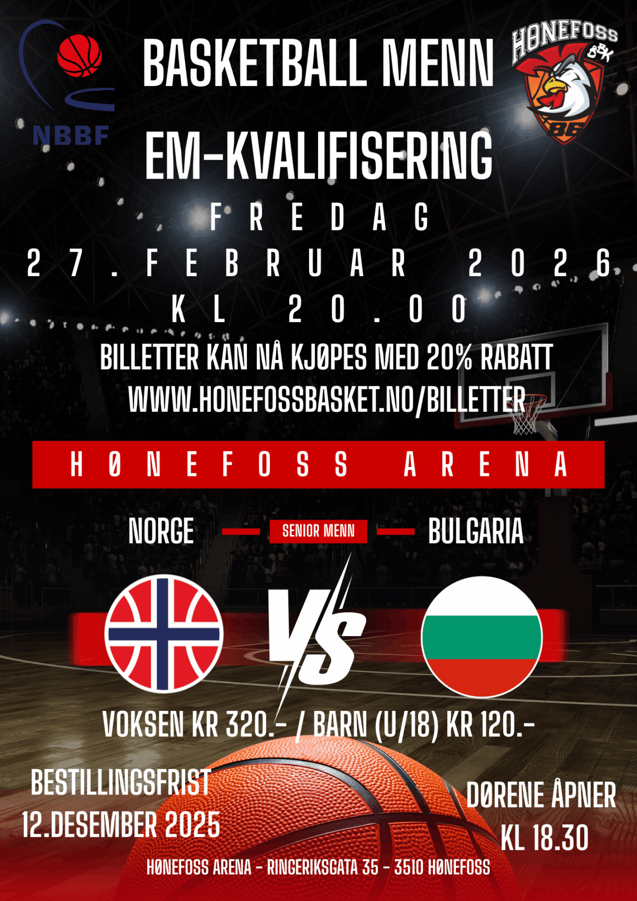 I forbindelse med herrelandskampen mellom Norge og Bulgaria i Hønefoss Arena fredag 27.februar 2026, er det nå mulig å bestille billetter til redusert pris. Ved bestilling via skjemaet nedenfor vil du få 20% rabatt.
